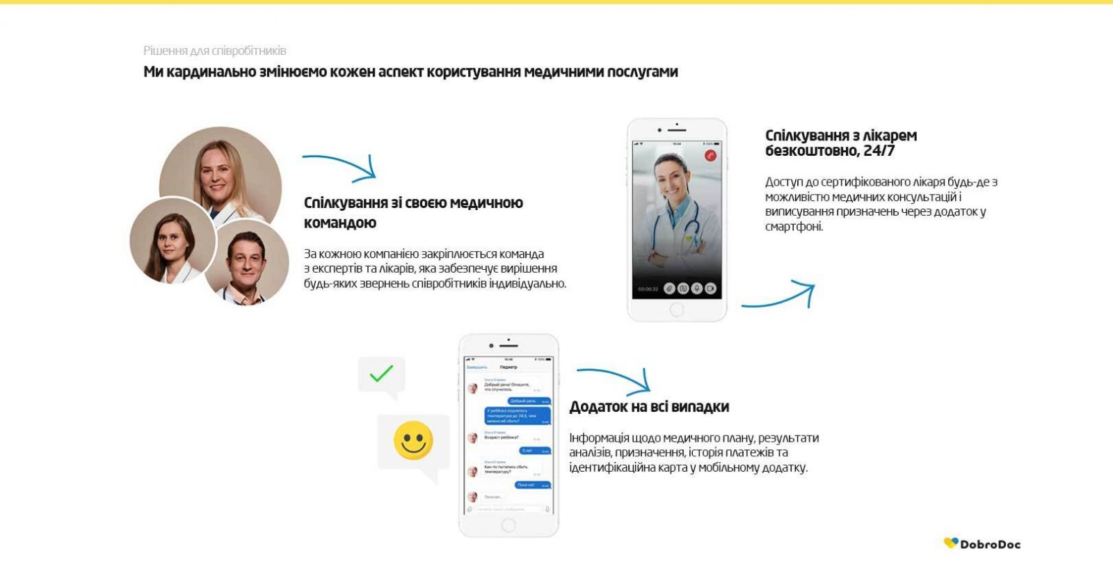 До того ж, в Dobrodoc+ за кожною компанією закріплений свій менеджер. Він допоможе керувати тарифними планами і вирішувати всілякі питання. Доступ до медичних послуг за замовчуванням доступний членам сім'ї співробітника. А ще у Dobrodoc+ є медичний консьєрж 24/7 — проконсультуватися можна в будь-який час доби.