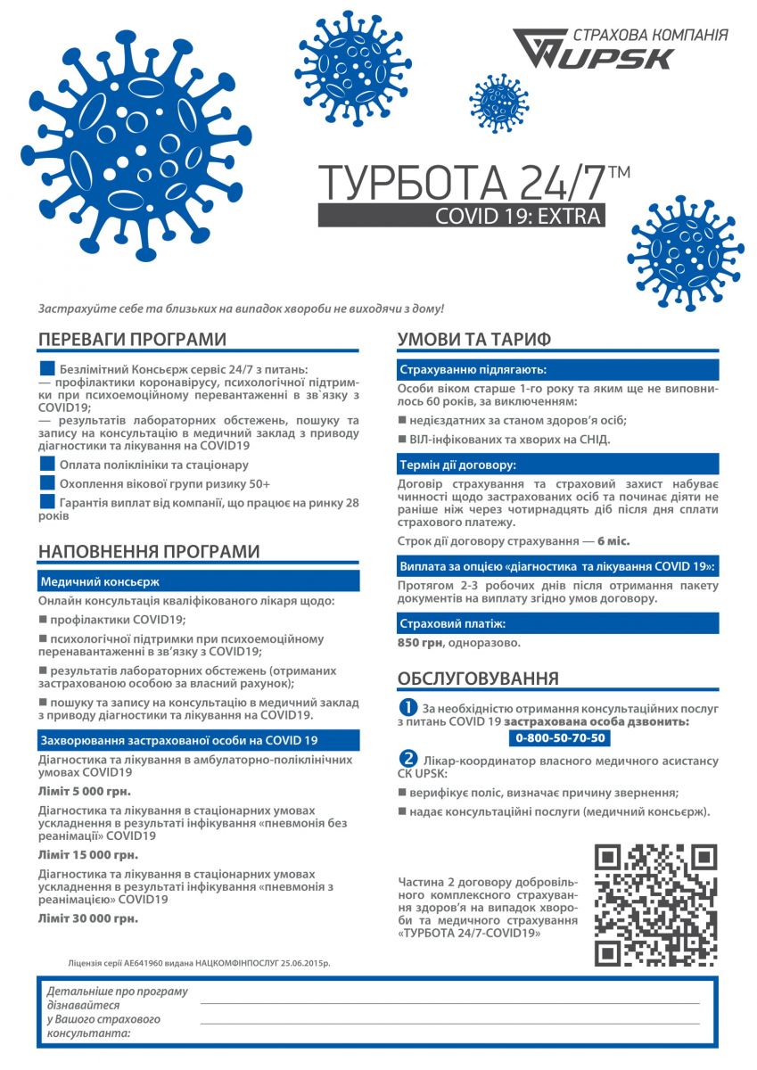 Программа «Турбота 24/7. Covid-19: Extra» гарантируют Вам финансовую защиту и поддержку на случай инфицирования коронавирусом. В услугу входят  медицинский консьерж 24/7: консультации лучших специалистов Мобильной клиники, в том числе психологическая поддержка при психоэмоциональной перегрузке в связи с заболеванием.